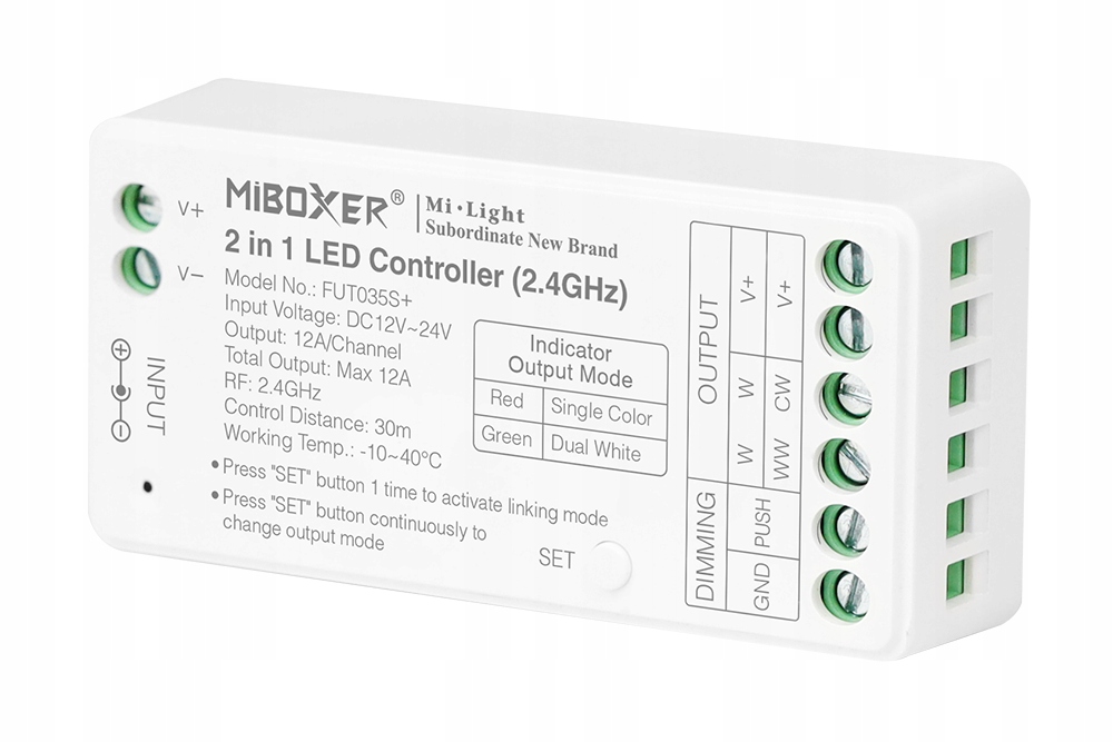 Kontroler LED FUT035S+ jest dedykowany do obsługi źródeł światła CCT oraz MONO. Został wyposażony w diodę sygnalizującą, która ułatwia przypisywanie i ustawianie parametrów. Sterownik posiada możliwość zmiany modulacji częstotliwości PWM. Wbudowana funkcja reapetera pozwala osiągnąć nieskończony zasięg, wystarczy zachować odległość 30m między kolejnymi urządzeniami MIBOXER.
