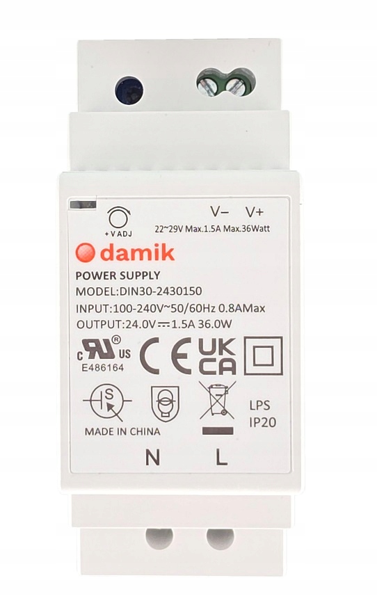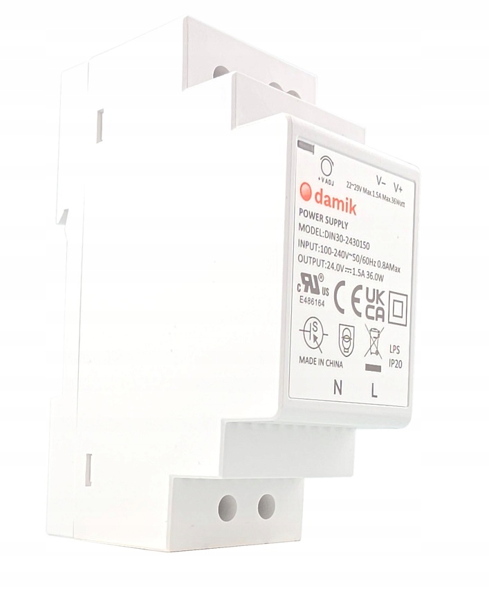 Nowoczesny, solidny zasilacz LED marki DAMIK montowany na szynie DIN – idealny do zasilania taśm LED, modułów LED oraz innych urządzeń wymagających napięcia stałego 24V DC.