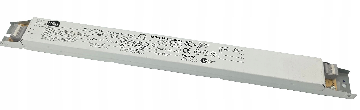 Statecznik wielolampowy marki B.A.G., model MLS80.1F-01/220-240, to wysokiej jakości, elektroniczny układ zapłonowo-sterujący przeznaczony do zasilania świetlówek różnych typów. Urządzenie jest kompatybilne z lampami T5, T8 oraz kompaktowymi TC-L, zapewniając ich optymalne działanie i wydłużoną żywotność.