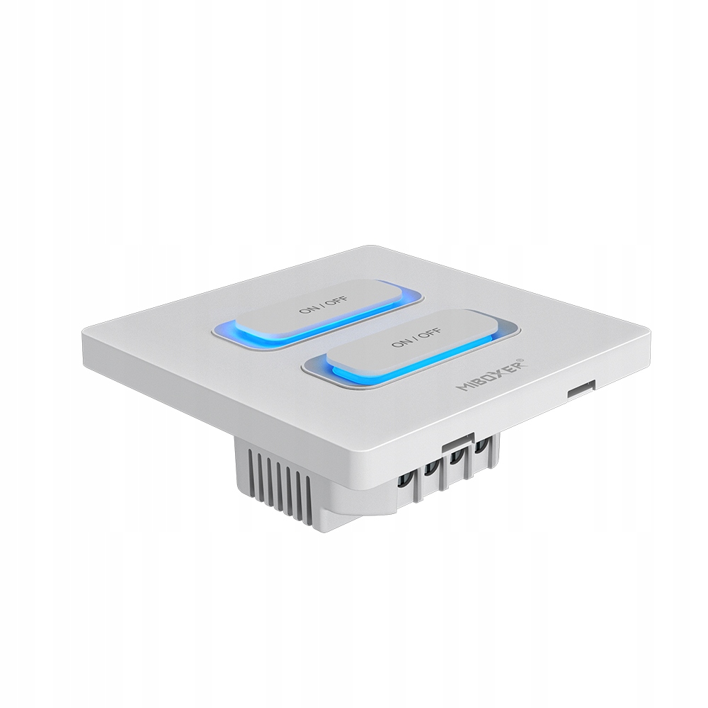 MiBoxer ESW2-W to nowoczesny, dwukanałowy przełącznik ścienny umożliwiający indywidualne sterowanie oraz płynne ściemnianie dwóch niezależnych stref oświetlenia. Urządzenie pracuje w technologii 2.4GHz RF i WiFi, zapewniając stabilną i szybką komunikację z kompatybilnymi odbiornikami MiBoxer / Mi-Light jak i podłączonymi do niego bezpośrednio lampami. WiFi zapewnia połączenie z aplikacją Tuya Smart aby zdalnie sterować oświetleniem domowym.